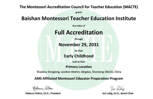 Baishan Montessori Teacher Education Institute Infant Toddler and Early Childhood programs are accredited by the Montessori Accreditation Council for Teacher Education (MACTE).